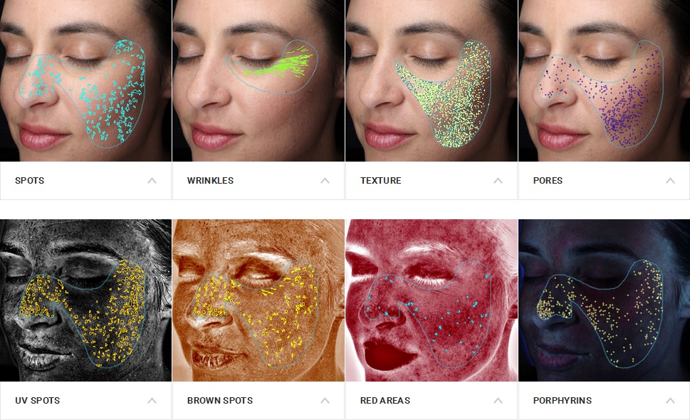 A VISIA imaging session captures key visual information for six areas affecting complexion health and appearance: wrinkles, spots, pores, evenness (color variation in the skin tone), porphyrins (evidence of bacteria in pores), and UV spots (characteristic of photodamage, typically from overexposure to sun).